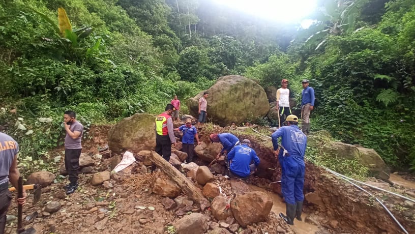 Kata Ade”Dari semalam kami sudah menerjunkan personil untuk sedikit demi sedikit mengevakuasi material longsor bersama masyarakat dan instansi terkait, pagi ini Alhamdulillah akses jalan sudah bisa dilalui kendaraan Roda Dua maupun Roda Empat sehingga arus lalulintas sudah normal kembali”.