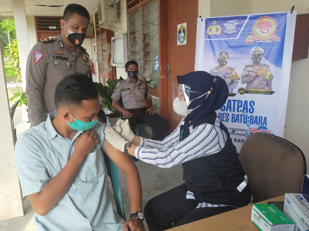 Kabarsimalungun.com. Batu Bara — Dalam rangka menyambut HUT Bhayangkara yang ke-75, Satpas (Satuan Penyelenggara Administrasi) SIM Polres Batu Bara melaksanakan pelayanan SIM keliling serta memberikan Vaksinasi Gratis bagi pemohon SIM di Perkebunan TIU ( Tanah Itam Ulu), Kec. Datuk Lima Puluh, Kab.Batu Bara. Selasa (29/6/2021), sekitar pukul 08.00 wib.