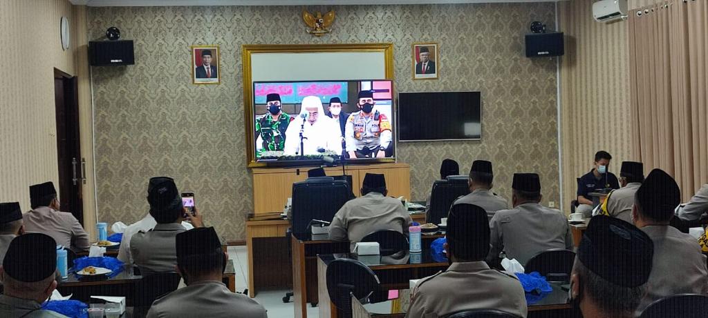 SERANG – Kepala Kepolisian Daerah (Kapolda) Banten Irjen Pol Dr. Rudy Heriyanto Adi Nugroho didampingi Wakapolda dan para PJU Polda Banten menghadiri kegiatan Zikir dan Doa Kebangsaan dalam rangka 76 Tahun Kemerdekaan Indonesia yang diadakan secara virtual di Ruang Vicon, Mapolda Banten. Minggu (01/8/2021) malam.