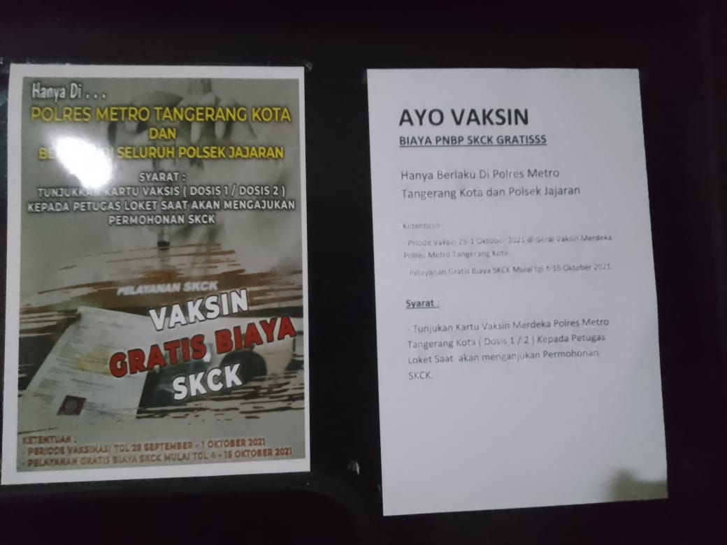 Hal demikian ini, merujuk Attantion dari Bapak Kapolda Metro Jaya diteruskan ke Kapolres metro Tangerang Kota dan dilaksanakan oleh Kapolsek Jatiuwung perihal tentang gratis biaya pembuatan maupun perpanjang SKCK wilayah hukum Polda Metro Jaya dengan batas waktu tanggal 01 Oktober 2021.