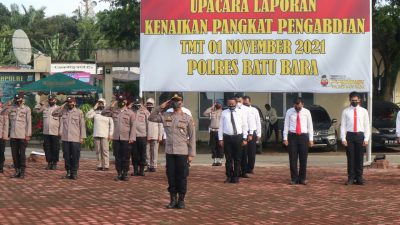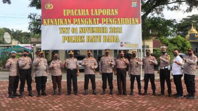 Kabarsimalungun.com. BATU BARA – Polres Batu Bara Polda Sumut melaksanakan Upacara Laporan Kenaikan Pangkat Pengabdian TMT (Terhitung Mulai Tanggal) 01 November 2021 Polres Batu Bara ,di halaman Apel Mako Polres Batu Bara, Jum’at 05 November 2021.