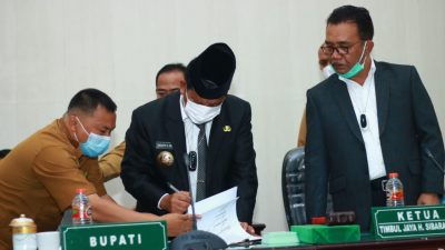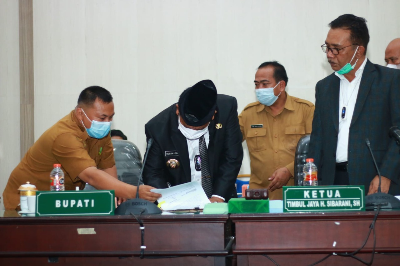Kabarsimalungun.com. SIMALUNGUN – Bupati Simalungun Radiapoh Hasihaolan Sinaga SH MH dan Ketua DPRD Simalungun Timbul Jaya Sibarani SH MH bersama Wakil-wakil ketua Samrin Girsang, Elias Barus dan Sastra Joyo Sirait menandatangani Nota kesepakatan Rancangan Kebijakan Umum Anggaran (KUA) dan PPAS Prioritas dan Plafon Anggaran Sementara) APBD Tahun Anggaran (TA) 2022.