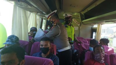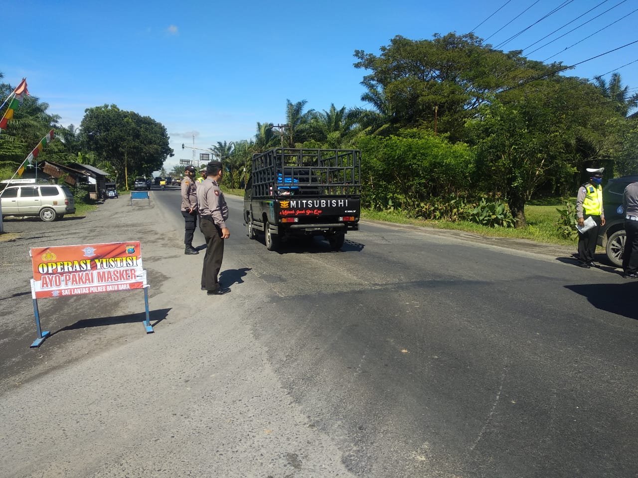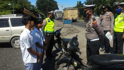 Petugas Operasi Yustisi melaksanakan pemeriksaan dan memberikan edukasi penerapan Prokes terhadap masyarakat pengguna jalan diantaranya pengemudi dan penumpang Kendaraan Roda Dua, Mobil Pribadi, Angkutan Bus dan Truck di sekitaran Jalinsum Sei Bejangkar -Kisaran Kabupaten Batu Bara.