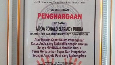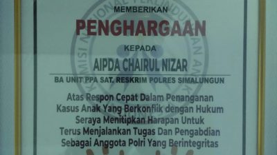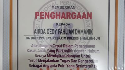“Piagam Penghargaan bentuk aprisiasi Komnas Perlindungan Anak kepada Kapolres Simalungun AKBP Nicolas Dedy Arifianto, SH, SIK, MH dan jajarannya yang sangat berkotmitmen dan tidak mau bernegosiasi terhadap kejahatan terhadap perempuan dan anak,”Pungkas Arist Merdeka Sirait.