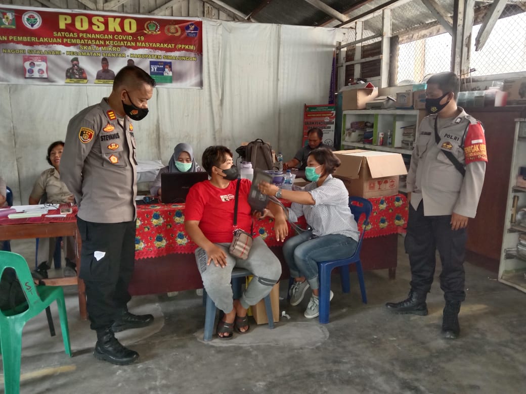 Kabarsimalungun.com. SIMALUNGUN – Kapolsek Bangun AKP L.S Gultom SH bersama Bhabinkamtibmas BRIPKA Lambas M Simamora monitoring pelaksanaan Vaksinasi tahap 1 dan 2 di Kantor Pangulu Nagori Karang Bangun Kecamatan Siantar, Kabupaten Simalungun, Kamis (9/12/2021) pagi sekira pukul 09.00 WIB.