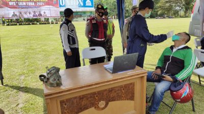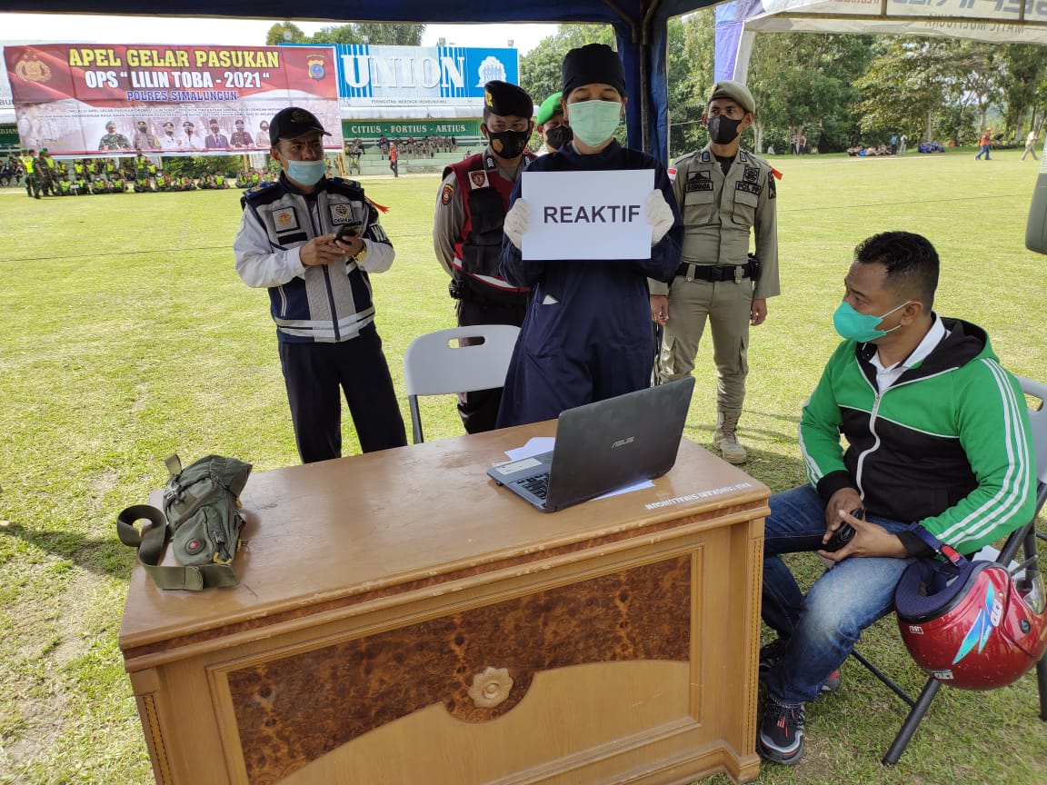 Kabarsimalungun.com. SIMALUNGUN – Dalam Simulasi Aplikasi Peduli Lindungi yang diperagakan personil Sat Lantas Polres Simalungun di Lapangan Olahraga Koramil Type A Kodim 0207/Simalungun, Kamis pagi (23/12/2021), setiap warga yang masuk dan melintasi wilayah hukum Polres Simalungun wajib menunjukan kartu vaksin dan jika reaktif siap-siap diisolasi.