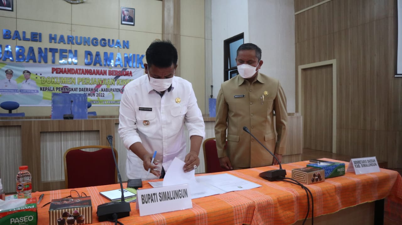 Kabarsimalungun.com. SIMALUNGUN – Kepala Perangkat Daerah se-Kabupaten Simalungun menandatangani dokumen perjanjian kinerja tahun 2022, bertempat di balei Harungguan Kantor Bupati Simalungun, Pamatang Raya, Sumut, Jum’at, (18/2/2022).