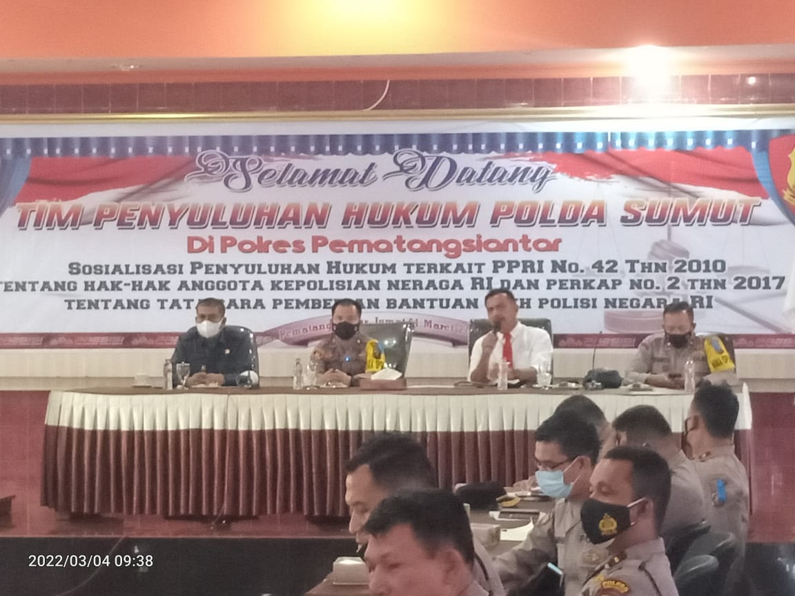 Kabarsimalungun.com. SIMALUNGUN – Kegiatan Sosialisasi Penyuluhan Hukum Polda Sumut digelar terkait PPRI Nomor 42 tahun 2010 tentang hak-hak anggota Kepolisian Negara RI dan Perkap Nomor 02 tahun 2017 tentang tata cara pemberian bantuan oleh Polisi Negara RI di Polres Pematang Siantar. Jumat, 04 Maret 2022 pukul 09.00 wib di Aula Polres Pematangsiantar.