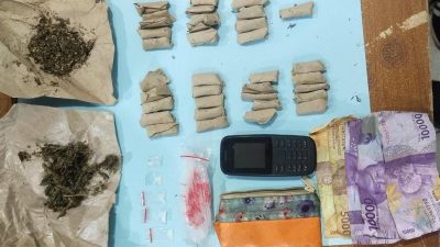 Ketika dilakukan penggeledahan terhadap pelaku ditemukan barang bukti daun ganja kering serta Sabu dalam penguasaanya. Barang bukti tersebut diakui kepemilikannya untuk di edarkan dan dijual.