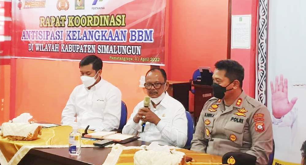 Kabarsimalungun.com. SIMALUNGUN – Dalam rangka mengantisipasi kelangkaan Bahan Bakar Minyak (BBM) Bupati diwakili Wakil Bupati Simalungun. H. Zonny Waldi, S,Sos, MM, bersama Kapolres Simalungun AKBP Nicolas Dedi Arifianto dan Sales Branch Manager Rayon III PT Pertamina Ahmad Fernando menggelar rapat koordinasi antisipasi kelangkaan Bahan Bakar Minyak (BBM) JBT (Jenis BBM Terbaru) di Wilayah Simalungun, Sumut, Senin (11/04/2022)