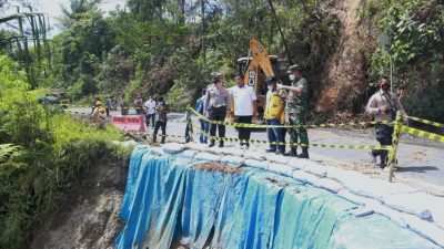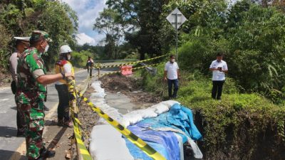 Kabarsimalungun.com. SIMALUNGUN – Bupati Simalungun Radiapoh Hasiholan Sinaga bersama Dandim 0207/SML Letkol Inf Roly Sohuoka, Kasat lantas Polres Simalungun AKP H Aritonang dan dari Kementrian PUPR Luisa meninjau jalan longsor penghubung Pematang Siantar dengan Kota Parapat persisnya di Nagori Parmonangan Kecamatan Dolok Panribuan Kabupaten Simalungun, Sumut, Selasa (19/4/2022).