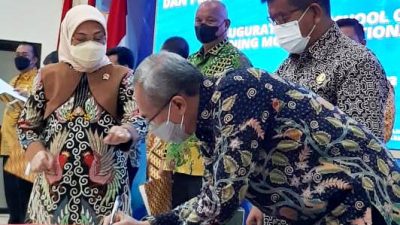 Penandatangan Nota Kesepakatan disaksikan oleh Menteri Ketenagakerjaan Ida Fauziyah, di Balai Besar Pelatihan Vokasi dan Produktivitas (BBPVP) Medan Jln Gatot Subroto No Km 7,8 Lalang Kec. Medan Sungal Medan Kota Sumatra Utara, Selasa (17/5/2022).