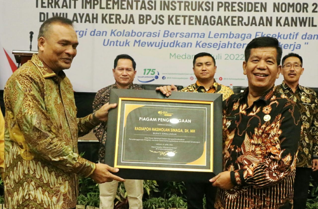 Kabarsimalungun.com ||| SIMALUNGUN – Bupati Simalungun Radiapoh Hasiholan Sinaga menerima penghargaan atas peran sertanya dalam mengoptimalkan penyelenggaraan program jaminan sosial Ketenagakerjaan di Kabupaten Simalungun dari Badan Penyelenggara Jaminan Sosial (BPJS) Ketenagakerjaan bersama sejumlah Bupati dan Walikota di wilayah Sumbagut.