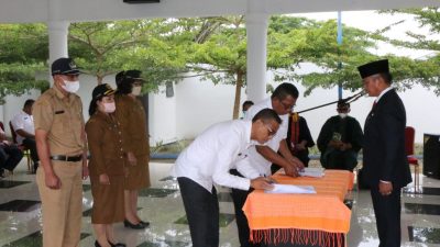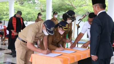 Selanjutnya para pejabat yang dilantik bersama pimpinan Organisasi Perangkat Daerah (OPD) melakukan penandatanganan fakta integritas yang disaksikan oleh Bupati Simalungun.