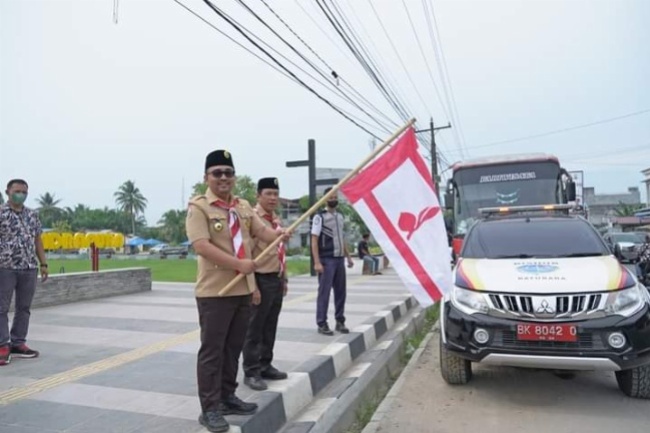 Kontingen Kwarcab Batu Bara yang akan berangkat ke Jamda Sumatera Utara dilepas oleh Bupati Batubara diwakili Wakil Bupati Batubara Oky Iqbal Frima, SE di halaman Kantor Camat Air Putih, Indrapura, Kamis (14/7/2022)