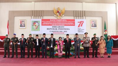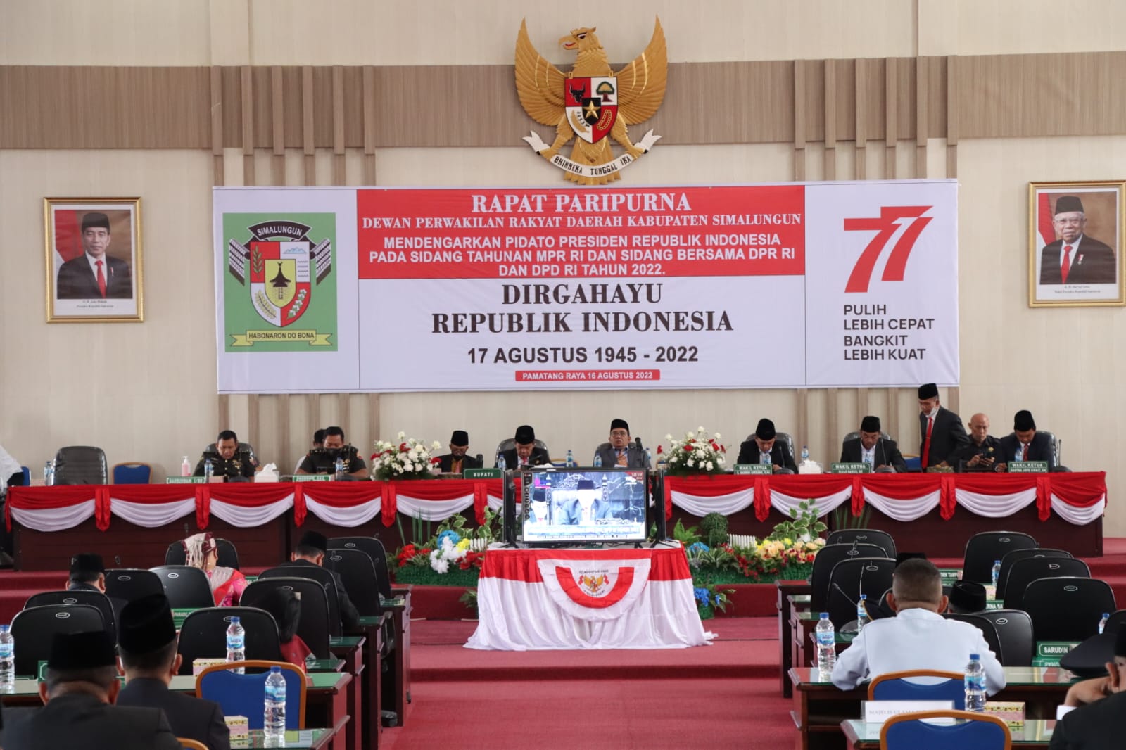 Kapolres Simalungun Akbp Ronald Fredy C Sipayung, S.H., S.I.K., M.H., bersama Unsur Forum Komunukasi Indonesia Kabupaten Simungun bersama anggota DPRD Kabupaten Simungun mengikuti kegiatan Sidang Tahunan MPR RI dan Sidang Bersama DPR RI dan DPD RI dalam rangka HUT Ke-77 Proklamasi Kemerdekaan Republik Indonesia secara virtual di Ruang Rapat Paripurna Gedung DRPD Kab. Simalungun Jln. Jon Horailam Saragih Kecamatan Raya Kabupaten Simalungun. Selasa(16/8/2022) sekira Pkl.09.30 WIB.