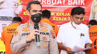 Kapolres Batu Bara AKBP Jose DC Fernandes SIK, didampingi Kasatreskrim AKP Jhon H Tarigan,Kasi Humas IPTU RN Zebua dan Kapolsek jajarannya, menegaskan akan berkomitmen untuk membrantas perjudian pada pres release ungkap kasus perjudian di teras Sat Reskrim Polres Batu Bara, Senin (22/8/2022).