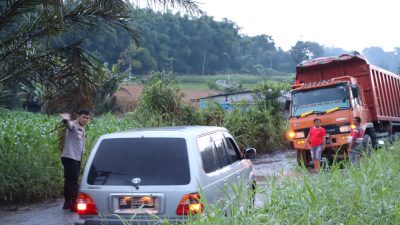Terlihat Kapolres Simalungun AKBP Ronald F.C Sipayung, S.H., S.I.K., M.H., dibawah rintikan hujan melakukan pengaturan arus lalu lintas yang sempat terhambat diakibatkan Truk tronton yang mengalami patah as, satu demi satu kendaraan berlahan berjalan dikarenakan truk tronton tersebut menutupi sebagian badan jalan.