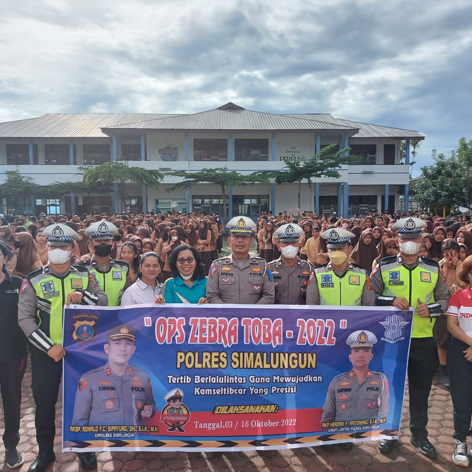 Kasat Lantas Polres Simalungun AKP Hendrik F. Aritonang, SIK, MH menerangkan bahwa untuk menekan angka pelanggaran dan kecelakaan lalulintas pada usia remaja Sat Lantas Polres Simalungun di hari ke 5 Ops Zebra Toba 2022 melaksanakan POLICE GO TO SCHOOL di SMK Negeri 3 Pematangsiantar Nagori Beringin Tapian Dolok dan memberikan sosialisasi TERTIB DALAM BERLALULINTAS dalam rangka Ops Zebra Toba 2022 yang dihadiri para guru dan seribu orang lebih siswa SMK Negeri 3 Pematangsiantar.