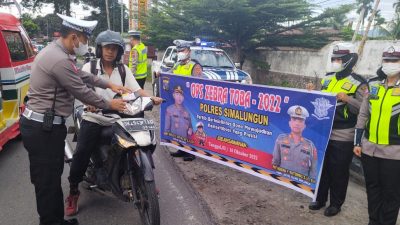 Kabarsimalungun.com || SIMALUNGUN – Jajaran Satuan Lalu Lintas Kepolisian Resor Simalungun melaksanakan kegiatan Operasi Zebra Toba 2022 dengan Memberikan edukasi akan pentingnya berkeselamatan di jalan yaitu dengan jangan menggunakan hp saat berkendara, dilarang mengemudi dibawah umur, berboncengan lebih dari satu orang, tidak menggunakan helm, mengemudi dalam pengaruh alkohol, melawan arus, tidak menggunakan sefety belt.
