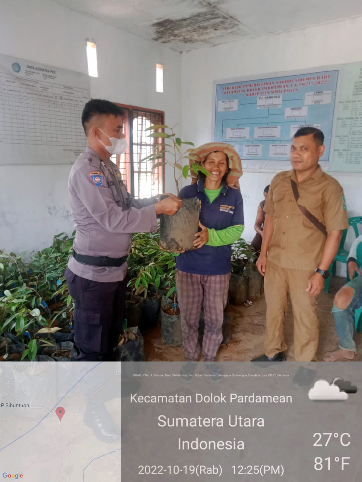 Kabarsimalungun.com || SIMALUNGUN – Dalam rangka mendukung ketahanan pangan Bhabinkamtibmas Polsek Dolok Pardamean Resor Simalungun AIPTU Winson Simatupang membagikan bibit buah alpukat, bertempat di Kantor Pangulu Sihemun Kecamatan Dolok Pardamean Kabupaten Simalungun, Rabu(19/10/2022) sekira Pkl.12.00 WIB.