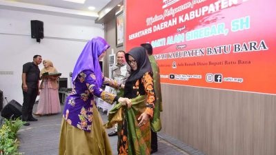 Acara ditutup dengan penyerahan cinderamata dari Bupati dan Wabup Batu Bara beserta Ketua TP PKK Batu Bara kepada Sekda Sakti Alam dan istri Ny. Hairani Sakti Alam.