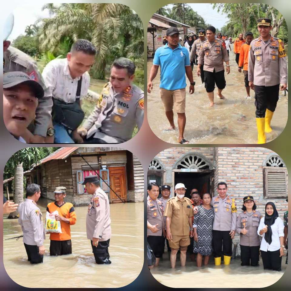 Kapolres Batu Bara,Polda Sumut AKBP Jose DC Fernandes SIK, bersama Pejabat Utama,Para Kasat, Kapolsek Labuhan Ruku,Personil Polres, Polsek dan Babinsa Tanjung Mulia Praka Firman Andika,Babinsa Sei Mentaram Koptu Hudawi Sinaga,Kades Tanjung Mulia Agus Salim,Sekdes Tanjung Mulia Burhanuddin Sinaga,Personil BPBD Batu Bara terjun langsung menerobos banjir, memberikan bantuan sembako berupa beras, minyak makan, Indomie kepada warga terdampak luapan air sungai, Senin (07/11/2022).