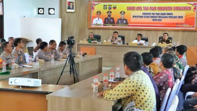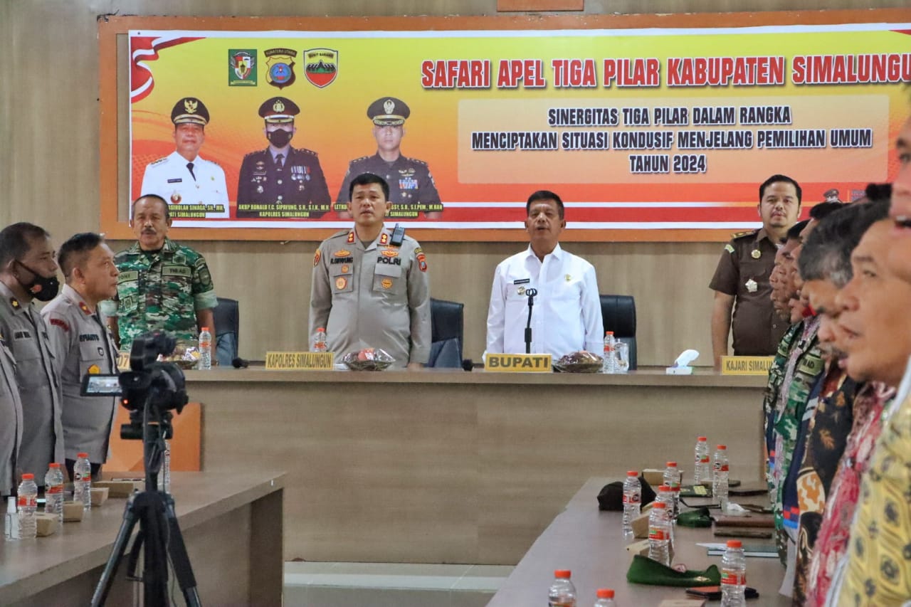 Kabarsimalungun.com || SIMALUNGUN – Bupati Simalungun Radiapoh Hasiholan Sinaga bersama Kapolres AKBP Ronald FC Sipayung, Dandim 0207/Sml diwakili Mayor Inf Toni Sembiring dan Kajari diwakili Asor Olodaiv mengikuti apel Sinergi dalam memelihara situasi Kamtibmas yang aman dan kondusif di wilayah Sumatera Utara yang digelar Polda Sumut.