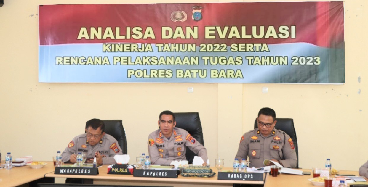 Kanarsimalungun.com || Batu Bara – Polres Batu Bara melaksanakan Analisa dan Evaluasi (ANEV) Kinerja Tahun 2022 Serta Rencana Pelaksanaan Tugas Tahun 2023.Kegiatan Anev di pimpin langsung Kapolres Batu Bara AKBP Jose Fernandes SIK, di Aula Wira Pradana Polres Batu Bara, Rabu (25/01/2023).