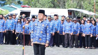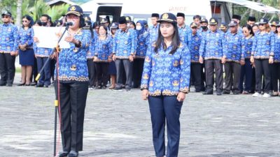 Selanjutnya Pembacaan Pembukaan UUD 1945 dilaksankan oleh Tiurma Marbun (ASN Dinas Perpustakaan dan Arsip) dan pengucapan Panca Prasetya Korpri dilakukan oleh Elly Ermawati Sagala (ASN BPKPD).