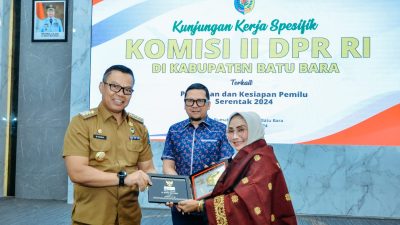 Disela kegiatan, Pj. Nizhamul memberikan kain tenun songket khas Batu Bara dan plakat kepada Ketua Komisi II DPR RI H. Ahmad Doli Kurnia Tandjung dan Staff Ahli Mendagri Bidang Pemerintahan Dr. Dra. Rochayati.(Martua)