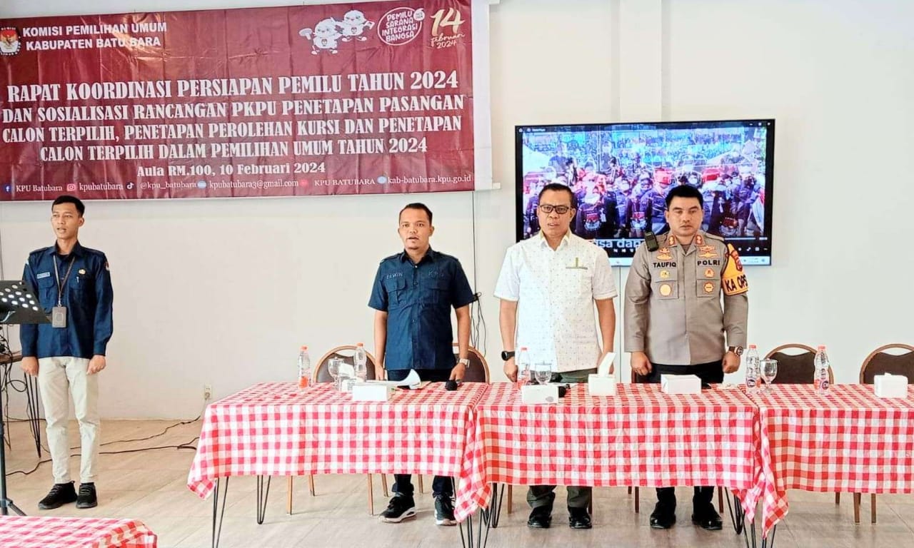 Rapat Koordinasi Persiapan Pemilu Tahun 2024 dan Sosialisasi Rancangan PKPU Penetapan Pasangan Calon Terpilih, Penetapan Perolehan Kursi dan Penetapan Calon Terpilih Dalam Pemilihan Umum Tahun 2024, bersama Kapolres Batu Bara,Pj Bupati Batu Bara, Bawaslu,Ketua dan saksi partai politik, Sabtu (10/02/2024) sekira pukul 11.00 Wib di Jalan Lintas Sumatera KM 100 tepatnya di Aula RM 100 Desa Tanjung Gading, Kecamatan Sei Suka.