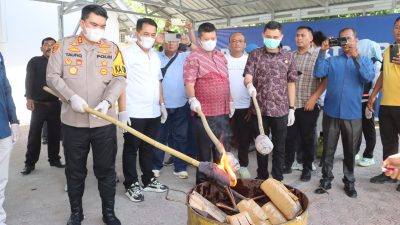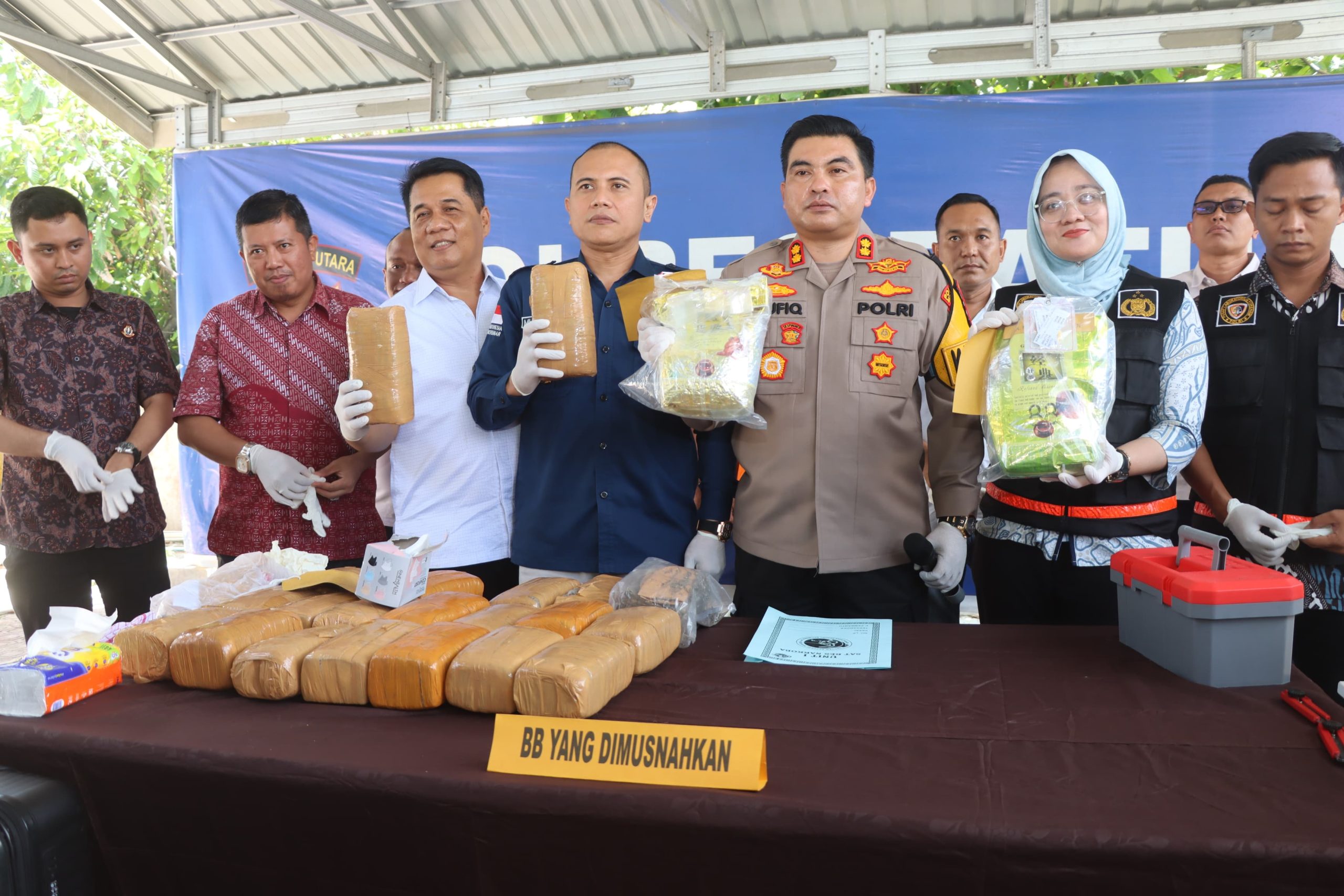 Didampingi Kasatres Narkoba AKP Fery Kusnadi, Kepala BNNK Batu Bara, perwakilan Kejari Batu Bara, perwakilan PN Kisaran dan tim labfor Polda Sumatera Utara pada kesempatan itu dimusnahkan daun ganja kering sebanyak 22 bungkus dengan berat brutto 20,937 kg dan sabu dengan berat brutto 1,546 kg serta 20 butir pil ekstasi.