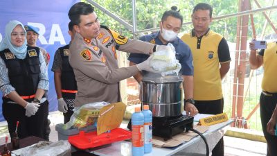 Selanjutnya Kapolres AKBP Taufiq mengawali pemusnahan sabu dan pil ekstasi dengan cara memasukkan kedalam panci berisi air panas.
