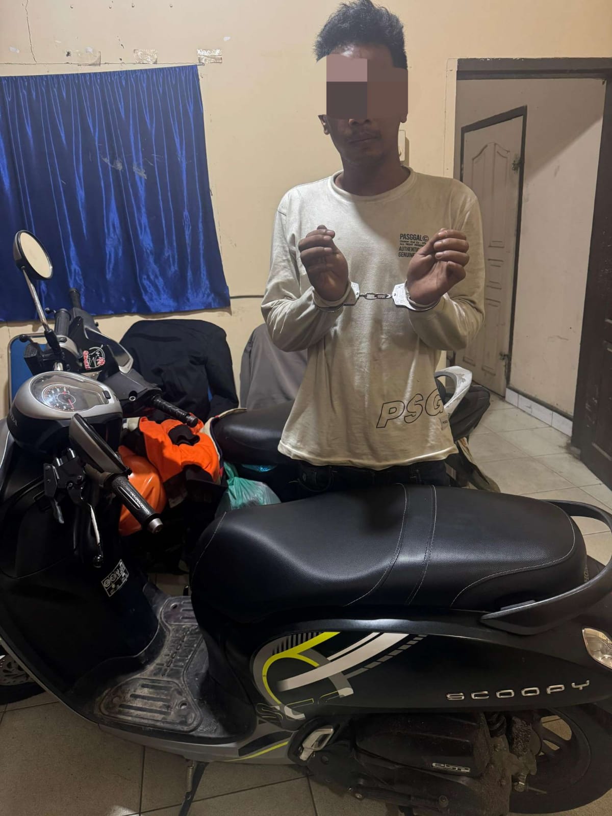 Gondel ditangkap atas dugaan melarikan sepeda motor Honda Scopy BK 4483 TBX milik Rizki Saputra,(30) yang tak lain tetangganya sendiri.