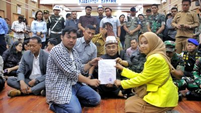 Bupati juga menandatangani fakta integritas sebagai bentuk komitmen nya untuk memenuhi semua tuntutan. Pertemuan antara Bupati dengan aksi unjuk rasa diakhiri dengan bersalaman.