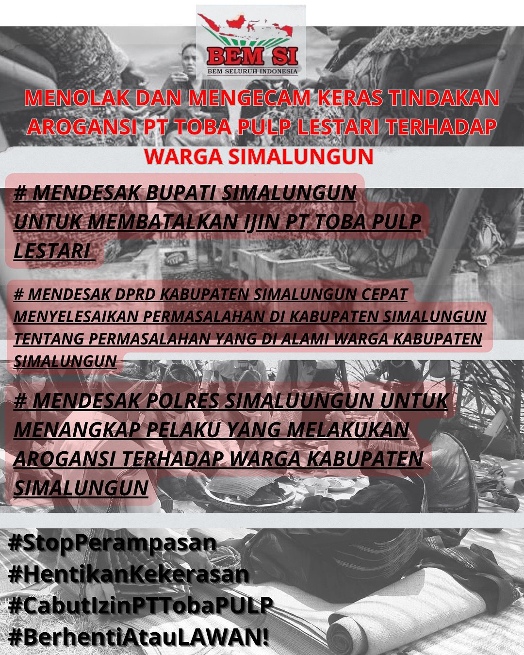 “Kami mendesak DPR RI, DPRD Provinsi Sumatera Utara, DPRD Kabupaten Simalungun agar cepat menyelesaikan permasalahan di wilayah Sihaporas Kecamatan Pamatangsidamanik Kabupaten Simalungun”