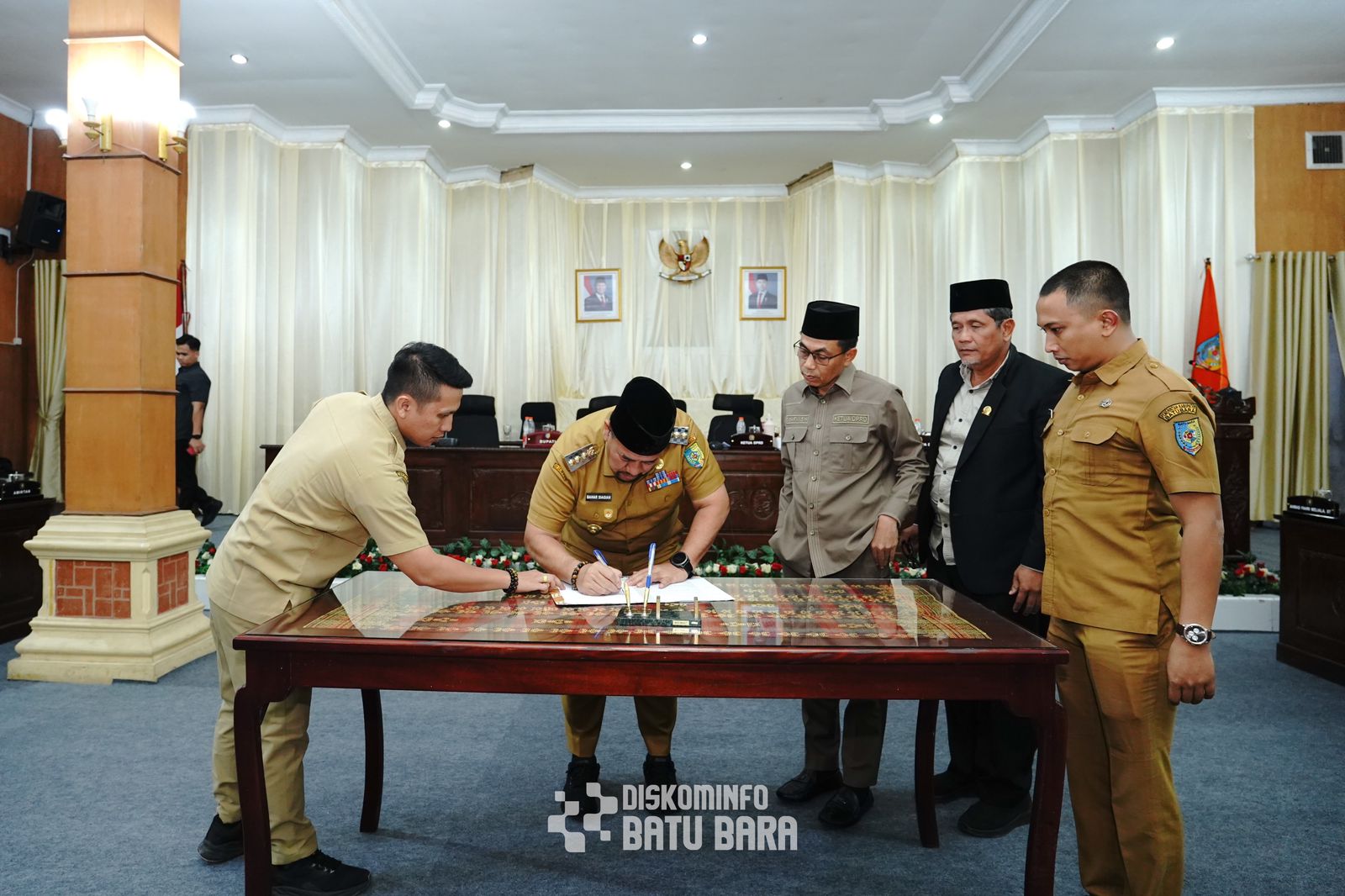 Setelah pembacaan laporan pendapat akhir dari masing-masing fraksi, kegiatan dilanjutkan dengan penandatanganan berkas berita acara pengambilan keputusan dan penandatanganan persetujuan bersama yang dilakukan oleh Ketua DPRD Kabupaten Batu Bara, para Wakil Ketua DPRD Kabupaten Batu Bara, serta Bupati Batu Bara.