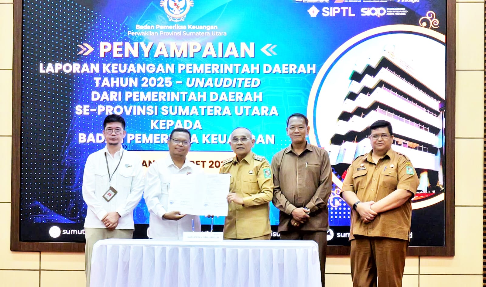 Acara penyerahan berlangsung di Auditorium BPK Perwakilan Provinsi Sumatera Utara, Medan, Selasa (31/03/2026), yang di hadiri langsung Kepala BPK Perwakilan Prov. Sumut, Paula Henry Simatupang. Turut mendampingi Bupati antara lain Plt. Asisten II Rinton Damanik dan Kepala BPKPD Simson Sauttua Pardomuan Tambunan.