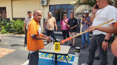 Kabarsimalungun.com || BATU BARA — Kasus pria usia 61 tahun mencekik selingkuhannya hingga tewas di Hotel Sorake Sei Balai direkonstruksi di halaman Satreskrim Polres Batu Bara, Selasa (28/4/2026).